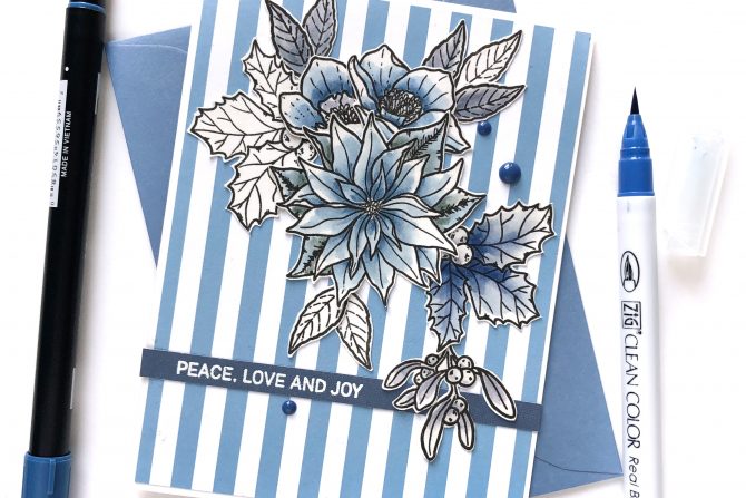 I stamped on Strathmore Bristol Smooth cardstock with Versafine Onyx Black ink and used a few different shades of blue in both Tombow brush pens and Zig Clean Color Real Brush Markers to color and used a small damp paint brush to blend the various parts of the whole arrangement. There are 8 different floral images and one sentiment in this set and I stamped them all separately, then cut them out and arranged them in position.