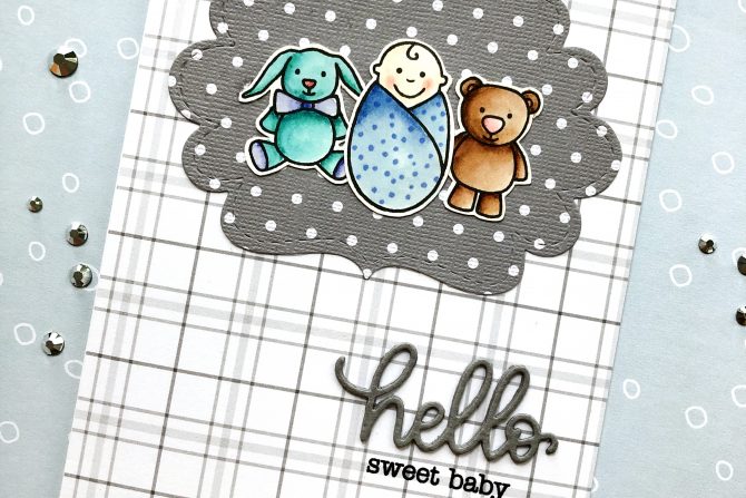 As well, I die cut the word “hello” 3 times from matching grey cardstock (found in my stash), and adhered them in a stack. I stamped the “sweet baby” from the Special Delivery stamp set with Versafine black ink and adhered the die cut stack above that.