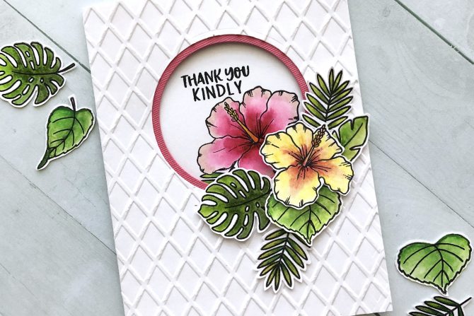 Hi, hello! It’s been a minute, huh? I’m back today with a card that I’m sharing on the Jane’s Doodles blog today, featuring a couple of stamp sets that give me all the Hawaiian vacation feels. I used the Hibiscus and Tropical Fun sets for the blooms and leaves, and the Kind stamp set for the sentiment.