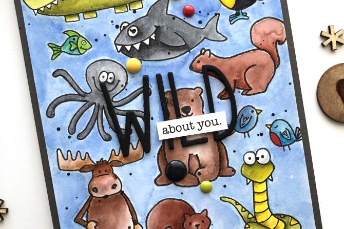 I combined several “wild” animals from various stamp sets, and stamped them with Versafine black ink onto Strathmore Bristol Smooth cardstock, then colored in the images and background using Arteza Real Brush markers and a water brush.