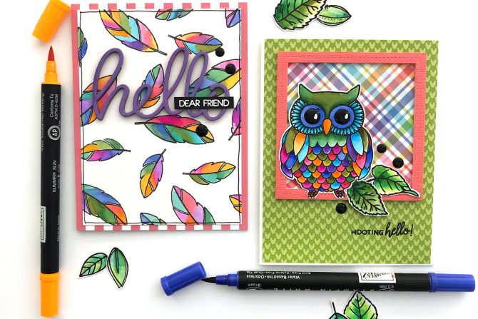 Not happy to let one colorful card be enough, I filled another card panel with random feather stamps from the same Wise Owl stamp set and used all the same colored markers to color them in, once again, using the water brush to help the colors blend and flow. To accomplish this, I colored each of the colors onto the Altenew watercolor palette, and used the water brush to pick up the colors and lay them down in each section.
