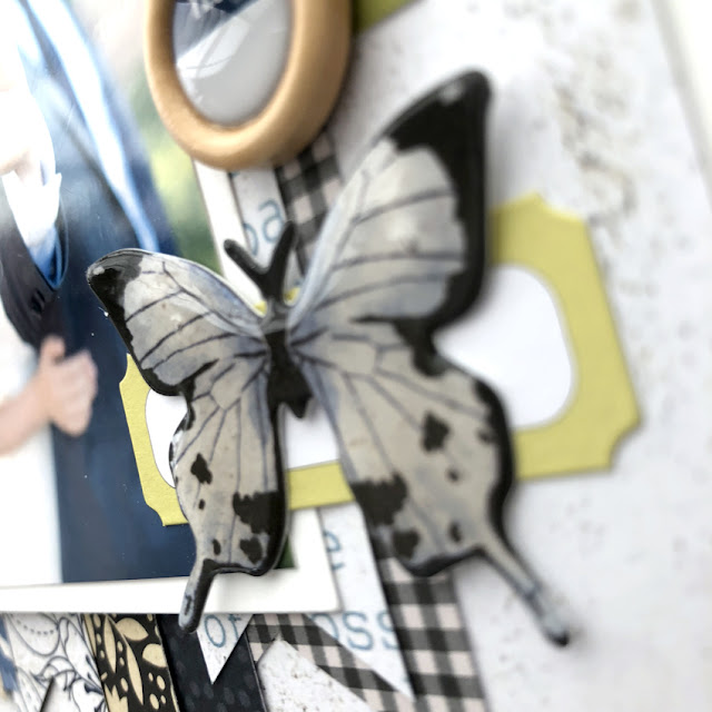 Another of the features of this layout that I wanted to share was the simple trick of elevating a basic die cut such as the butterfly above, from “meh…” to “wow!” by covering it with Glossy Accents to replicate an epoxy embellishment.  So easy to do and such a fun result!
