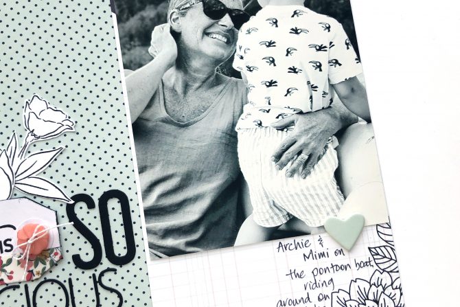 Other supplies used on the page include: Freckled Fawn flower paper, Felicity Jane polka dot paper, chipboard heart and scalloped washi tape. Also, Bella Blvd puffy heart, Memory Box alphabet dies (precious) and Altenew Alpha dies (SO), and Concord & 9th alphabet stamps.