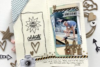 I used a lot of Felicity Jane scrapbooking kit supplies on this page – the background paper, the chipboard embellishments (summer, watermelon, flipflops and polka dot heart). I also used Memory Box die cut alphabet letters, but I don’t remember who makes the washi tape or the button.