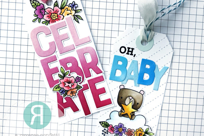 Hi, hello! I’m sharing a couple of tags today for Reverse Confetti’s June Stock Your Stash challenge and I’ll admit straight up that I gave the theme of Hello/Just Because some pretty wide parameters, making tags (because I need some for my stash) for a baby gift and a celebration (again, because my stash needs both of those!)