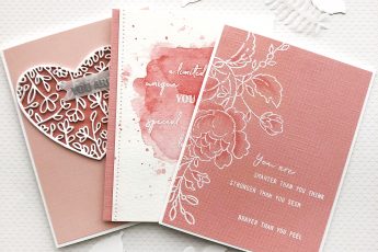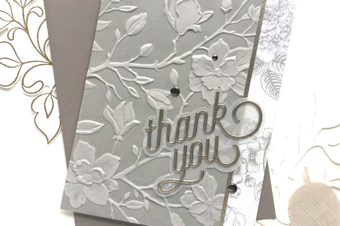 For today’s Thank You card, I combined the Magnolia Branches embossing folder, and the Swoopy Thank You word dies and added some patterned paper and platinum embossing powder to tie it all together.