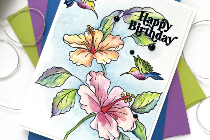 I have two cards today, both made using the Hibiscus Blooms stamp set, but each done with a different medium on different paper. The first is stamped on watercolor cardstock and watercolor painted.