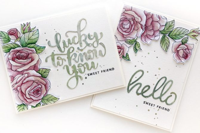 For the sentiments on each card, I die cut from watercolor paper, but before removing the die cut, I watercolored (with actual watercolor paint) all over the die cut and let it dry. I went back a 2nd time with more paint to add more color and depth to each design. The “hello” is the smaller of the two sentiments in this CZDesigns Hellos Dies set and the “lucky to know you” is this die set from SSS. I used part of a sentiment from the Hello You stamp set to add the “sweet friend” below each die cut.