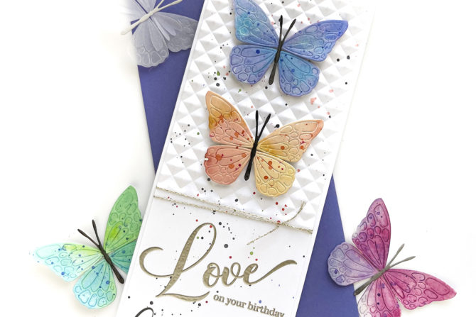 For the lovely butterflies, I used the Etched Butterfly die set to cut from watercolor paper, “painting” them with the ink smooshing technique where you smear 2-3 water-reactive inks onto a smooth surface, spritz water onto the ink and lay the die cuts face down onto the wet paint, then letting dry and splattering with darker ink. I added the same colors of paint splatter to the embossed/stamped card panel and adhered the butterflies with foam tape behind to give them some extra extra. I wrapped some gold metallic thread around the card panel before adhering everything to the card base.