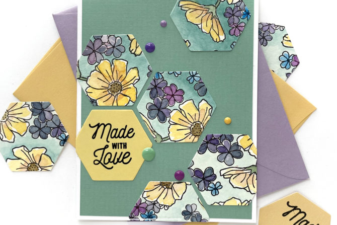 Then! I die cut all the hexagon shapes from the painted panel! I could tell you that was my intent from the first, but nope, I just wasn’t as excited by the painted all over design as I wanted to be, so I did a hard 90º shift. I stamped one of the sentiments in the set and die cut it into a hex shape as well, and as I positioned the painted hexies on the card front, I fell in love with the images again!