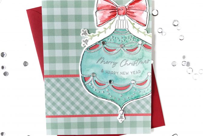 Finally, I used a Copic Multiliner pen to add some sketchy outlines to the ornament and the bow, adhered some flat, silver sequins to the ornament, and with that, the card is complete.