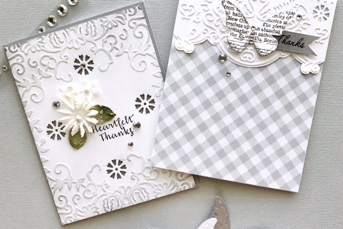 My second card shows the all over design of the Botanical Frame die and embossing folder. After embossing (and die cutting) the flower shapes, I very lightly inked the edges and raised design with grey ink and popped up the card panel with foam tape for fun dimension. I stamped the sentiment, added some white flowers and a few more rhinestones to finish.