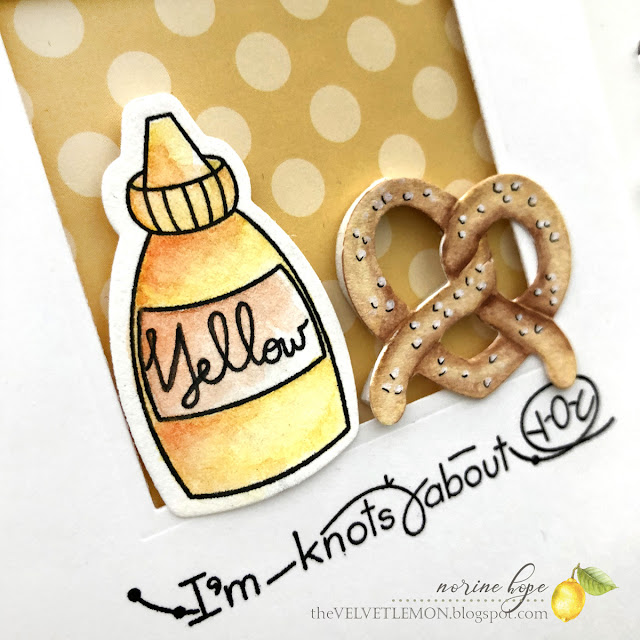 For this next card, I created the pretzel the same way as outlined above.  I also stamped and die cut the mustard bottle from watercolor paper before coloring and painting it with the Faber Castell watercolor pencils and a water brush.  I used the Nestabilities Classic Squares dies to cut an opening into a Neenah Solar White cardstock panel, stamped the sentiment below the opening and popped up both the cardstock panel and the pretzel and mustard with dimensional foam tape against a patterned paper background.  And with Herculean effort, I left it at that!  Yay, another point for CAS me!
