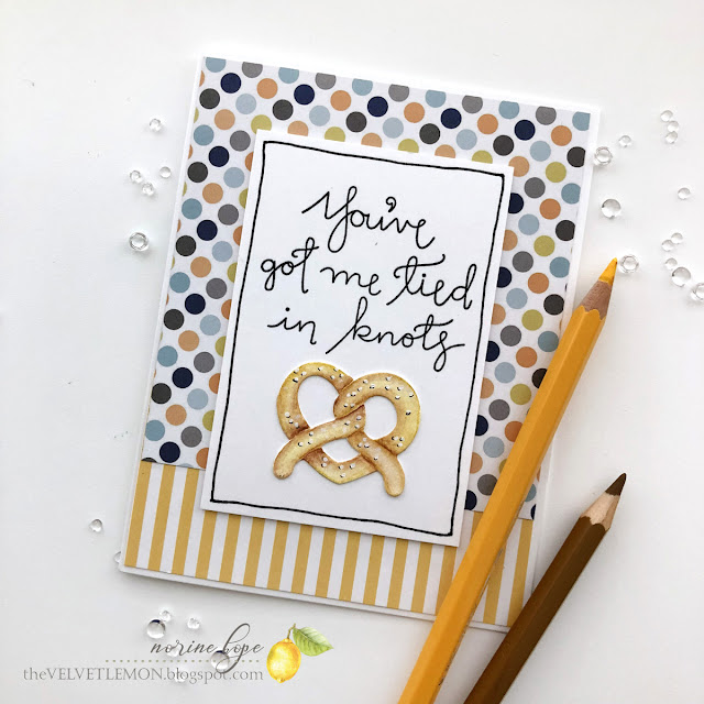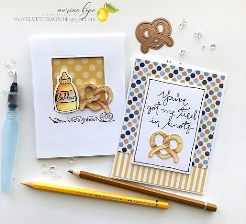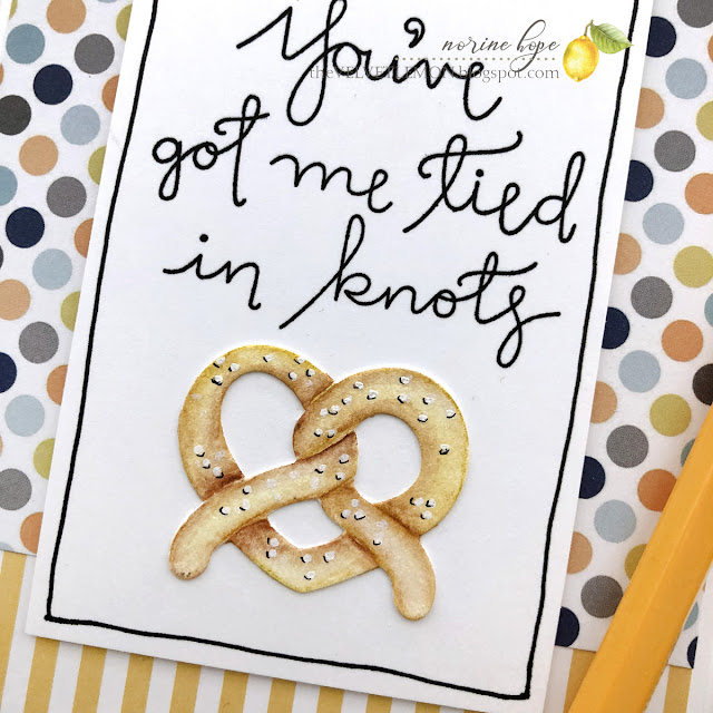 For these cards today I used the stamp and die set called Twisted.  I die cut the pretzels from watercolor paper and colored them with my Faber Castell watercolor pencils then “painted” them with a water brush.  I stamped the larger sentiment on a piece of Neenah Solar White cardstock and layered that over a coordinating patterned paper combo background, with nothing more than a Copic liner pen drawn outline.