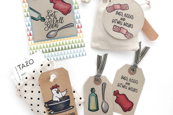 I used the stamp set Get Well along with the adorable Mini Canvas Bags from FSJ. I saw those little bags and I could only think about tea bags and band-aids and Skittle “pills” and such. How cute would it be to receive a get well card or tag with an accompanying little canvas bag??
