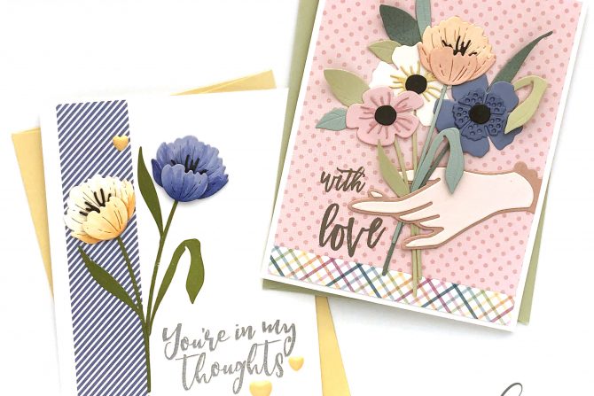 For my first card I used all of the dies in the kit, layering and building up the florals, and the hand, and arranging the bouquet just so.
