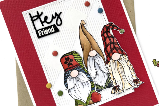 I stamped the three gnomes in the stamp set onto Neenah Solar White card stock with Copic friendly ink, and colored them with Copic markers before fussy cutting them with my Cutterbee scissors. (There are coordinating dies available).