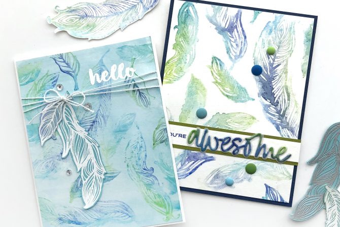I had to try them a few different ways and so obviously, the result is going to be a fresh stack of cards! Let’s start with the first two. Spellbinders was also kind enough to send me some stamps and dies to work with, and for these cards I was all over the Floating Feathers stamps, also part of the Jane Davenport Artomology release.