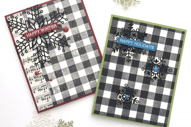For the first card, I used one of the set of three layering dies that make up the whole layered snowflake, opting for the most finely detailed of the three, to balance the chunkiness of the plaid stamped card panel.