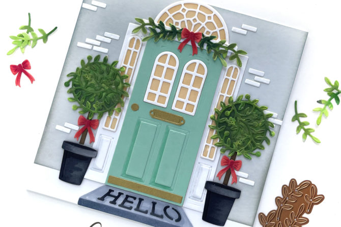 Once all the door/pieces and window layers were cut, colored and glued in place, I turned my attention to the seasonal greenery polishing up the front door so beautifully, creating a bough over the door made of leftover pieces from the Door Base set and building two matching topiaries at the front door and adorning them with lovely red bows! I added some shading in a few places with coordinating Copic markers, such as the lower panels on the door and side panels.