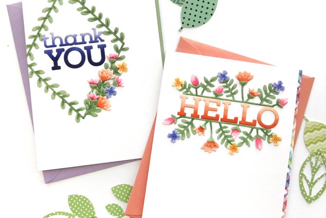 The kit dies include besides the letters to spell out “thank you” and “hello”, a selection of vine and floral dies to create a parallelogram (had to ask someone what that was called again) frame.