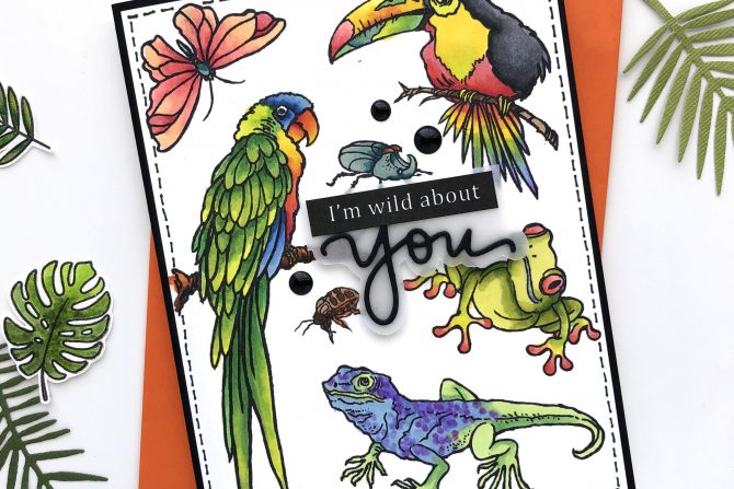 Hey, hello! I’m back today with a card project that is waaayy overdue! The lovely folks at Stampendous sent me some products a while back with the invitation to use them and share what I’d made! Well, a fair bit of travel has happened in the between time and I am FIIInally now sharing some projects. Today I’m sharing a card that I made using the Jungle Life Perfectly Clear stamp set. (Watch for more to come over the next few days and weeks!)