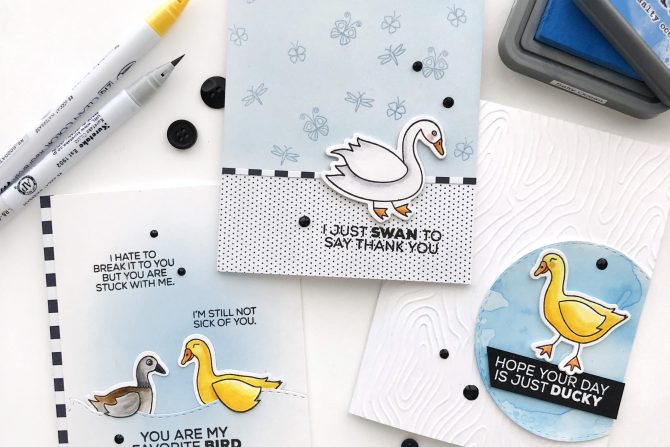 The stamp set I used for today’s cards are from the June Technique Tuesday release, called Duck Swan Goose, and it’s just one of several seriously cute stamp sets plus coordinating dies – all summer related.