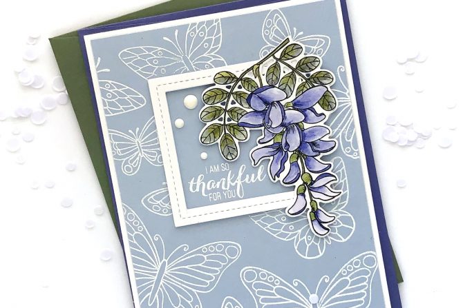 Hi friends, I’m back today with a pretty floral card to share with you! I used the May Greenhouse Society stamp and die set called Cascading Flowers as well as an older set called Beautiful Butterflies to create the background.