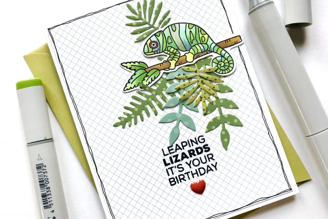 I used all the shades of green to color the chameleon and then used the MFT Wild Greenery dies to die cut tropical leaves from a coordinating variety of green patterned papers in my stash.