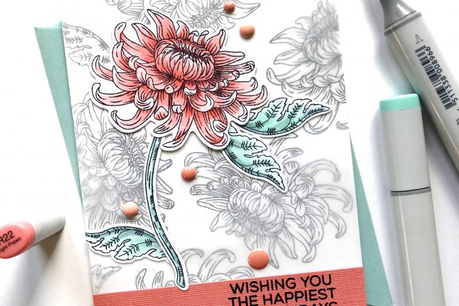 Hello, hey! Here I am again, back with another card to share! Technique Tuesday’s September Greenhouse Society stamp and die set is a beautiful Chrysanthemum, and today I’m sharing the first of two cards I made with this set. To see the rest of the September release and the video, click here.