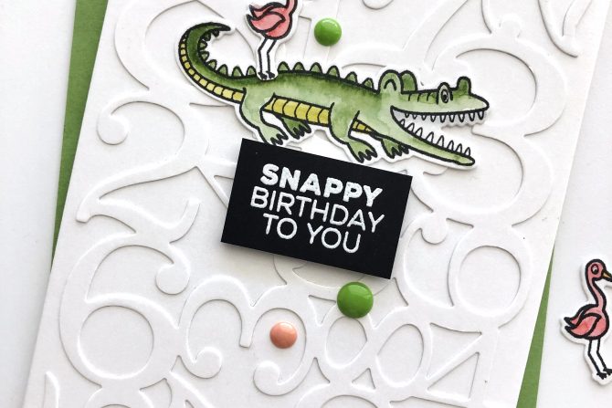 Over top of that I adhered the stamped, Arteza Real Brush marker colored and die cut alligator (or is it a crocodile? Other than where they live but not much more – they are a closely related reptile – I’m not going to try and distinguish between them) onto the number die cut, along with a stamped and white heat embossed sentiment that I popped up with a layer of foam tape.