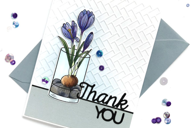 In January, the Greenhouse Society set included the crocus in a jar image plus 8 individual sentiments and a coordinating outline die for the crocus as well as word dies to cut out Thank, Miss and You. I used the dies to die cut my greeting from heavyweight black cardstock, and added an extra strip to separate the background and foreground.