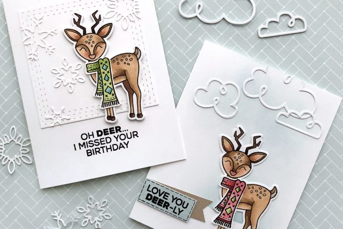 Hi, hello! I have the deer-est couple of cards to share with you today! Sorry, but puns! Who can resist? It’s one of the things I love best about Technique Tuesday designs. They kill it with the puns. Every time. And the set I’m showcasing today uses puns to take a “traditionally” Christmas themed image and stretch it’s use to so many other occasions; belated and/or on-time birthday, get well soon, happy new year and friendship! What’s not to love about that!?