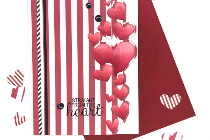 Lastly, I have a card made with the Cascading Hearts Border Die. For this card I glued the red striped patterned paper to the front of a folded card base, then ran it through the die cutting machine with the Cascading Hearts Die.