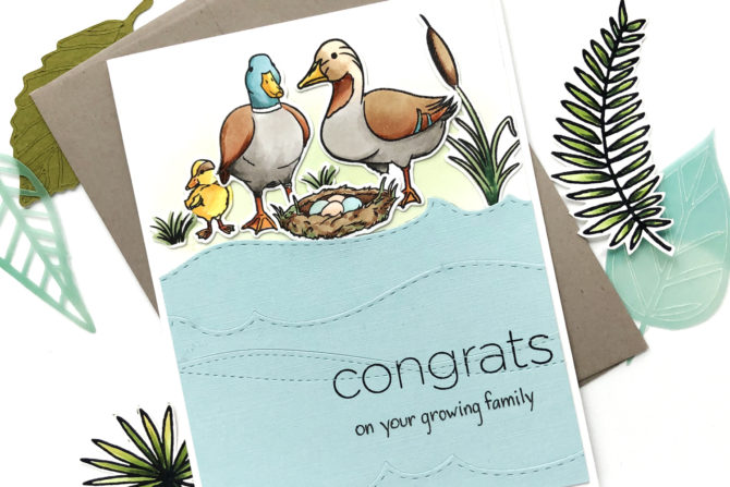 To create the card background I lightly ink blended some green at the top of a folded white cardstock card base to suggest grass. Then I die cut a piece of light blue textured cardstock with the Drifting Stitches Borders and the Ocean Waves Trio dies, then stamped a Congrats sentiment with black ink and clear heat embossing.