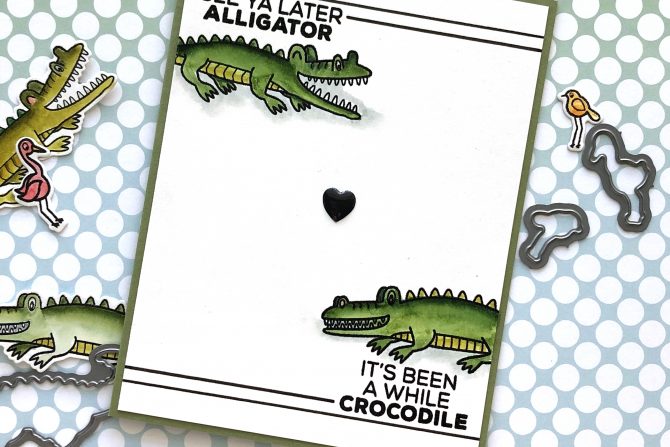 I used the Animal House stamp set called Alligators and Crocodiles to create today’s card. There is also a coordinating die set although I didn’t use them on this card. I probably I don’t have to remind you how much I love the punny sentiments that Technique Tuesday does so well, and this month is no exception!