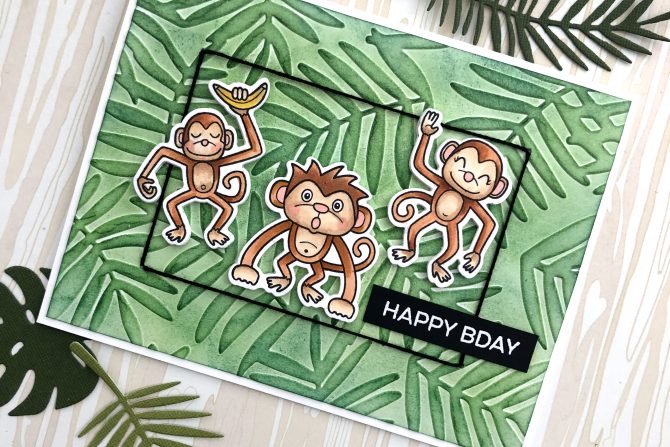 I used a similar technique on this card as I did for another monkey card this month, where I created the background by running an A2 card panel through the Sizzix machine with a Darice Ferns embossing folder (widely sold out – check eBay or Etsy) and then ink blending all over the card stock with two shades of green ink – Ranger Distress Ink in Mowed Lawn and Pine Needles.
