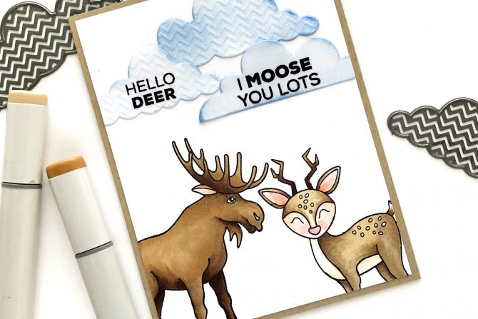 I positioned the stamps so that it looks like the moose is whispering into the ear of the deer. *grin! Then I gave them sentiments to express by stamping onto white cardstock and die cutting them into “thought clouds”. That’s a thing, right?