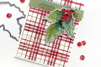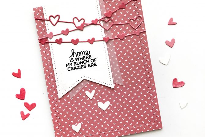 I used a stitched rectangle frame die to die cut a textured outline for the heart patterned paper and adhered it to a card base. Then I arranged the tags squeegee-like and glued the heart string die cuts over top. Instead of enamel dots, I used the heart punch outs from the heart strings die to complete this card.