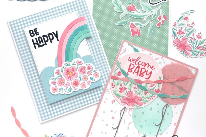 Finally, we have a card created using the Think Happy Stamp and Die Combo. I’m taking liberties with color lately and I decided that a pink and blue/green rainbow would be so pretty! And that cloud with the flower die cuts?! Those florals would be cute used separately, but I love them colored and still in their die cut openings!