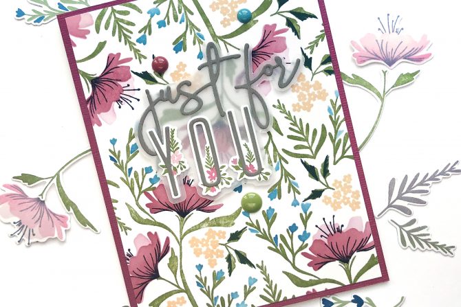 After stenciling and stamping the background card panel, I created the sentiment by stamping the miniature florals that go with the Slim Alphas and the Alphabuds Slim stamps and dies. I die cut the “just for” using one of the Sentiment Starter dies, and the Y, O and U from the Slim Alpha dies, adhering them overtop the stamped florals.