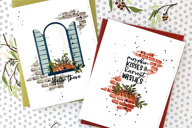 The technique for stamping the window opening, shutters and bricks on the second card was much the same, stamping the pumpkins first, coloring, then masking the pumpkins and stamping the rest of the scene. I like the juxtaposition between the outline image colored in, with the ink/stamped supporting images and the way it draws the focus to the sweet little window arrangement.