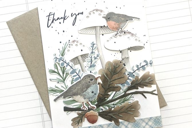 Card-making-wise, I’m in January, but my heart is in April and July and September so I have bits and pieces from several different stamp and die sets all layered together to create this sweet “thank you” card. An evergreen bough for winter, birds for spring, mushrooms and eucalyptus for summer and oak leaves for fall!