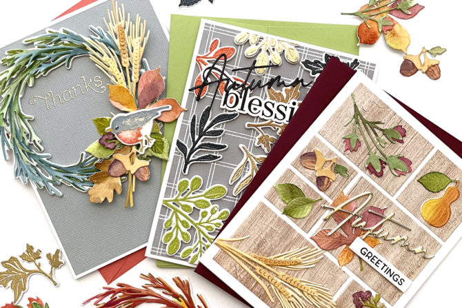 My first card features the Curio Autumn Die set with sweet little fall themed die cuts – all designed to go along with the Curio Divider die from a couple of releases ago!