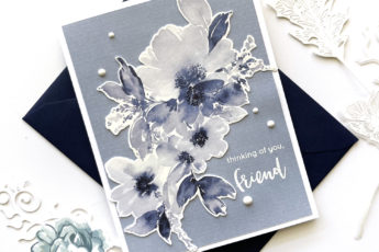The wreath base is popped up on a layer of fun foam for extra dimension then adhered to the card front framing the silver embossed “thanks” sentiment from the Rustic Wreath set.