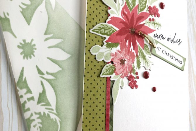 I die cut the completed stamped image and adhered it to the card base over the patterned paper strips and leaving room to stamp the “warm wishes” sentiment from the With Love at Christmas stamp set. (There are also a selection of smaller coordinating stamp images and dies in the With Love at Christmas stamp set). I stamped the label (also in this set) and added more of the sentiment to that, then punched a hole in both the label tag and the flower itself, and tied them together with gold cord. I stenciled onto an envelope flap with the coordinating Flappable Stencil and I love how well they go together!