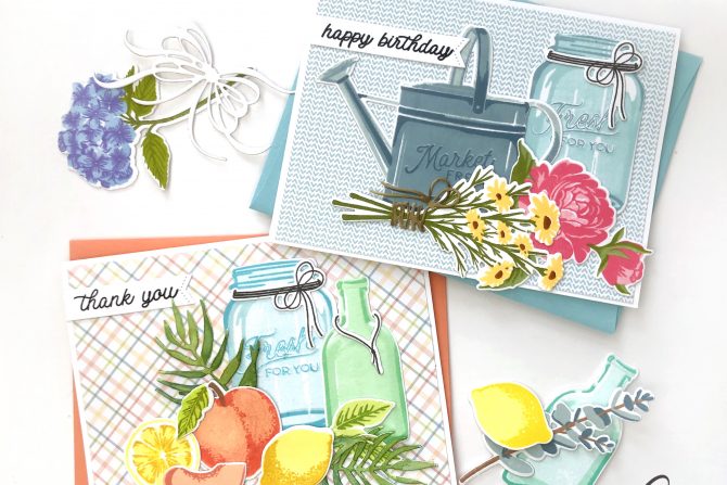 I used the jar from the Just Mason Around set, the green bottle from the Bottled Up stamp set, adding the stamped and die cut ties overtop the jars for extra dimension. I also combined the lemons from the Lemon Blossom stamp and die set, and the peaches from the Print Shop – Peachy Keen, with the die cut and watercolor painted leaves from the Botanicuts Palm Die set.