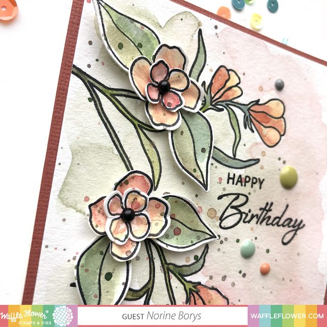 I painted both the card panel and the extra flowers and leaves with the same palette of colors I used on the card above, and once again, added a soft background wash and more paint splatters with the same colors. Then I die cut the leaves and flowers, and after gently creasing and massaging each petal and leaf, adhered them to each other and then to the card front. The Birthday greeting is also from the Waffle Flower Lotus stamp set. Both cards are completed with an assortment of coordinating colored enamel dots on the flower centers and the background.