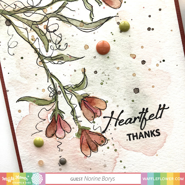 I used the same colors of mixed paints to daub on a wash of background color after the leaves and flowers were dry. Then I used my Copic Multiliner pens to add back a general sense of leaf, branch and petal outlines along with some extra tendrils. And finally I splattered on more of the paint I’d used for the painting. I stamped the greeting using a combination of word stamps from the Waffle Flower Lotus stamp set.