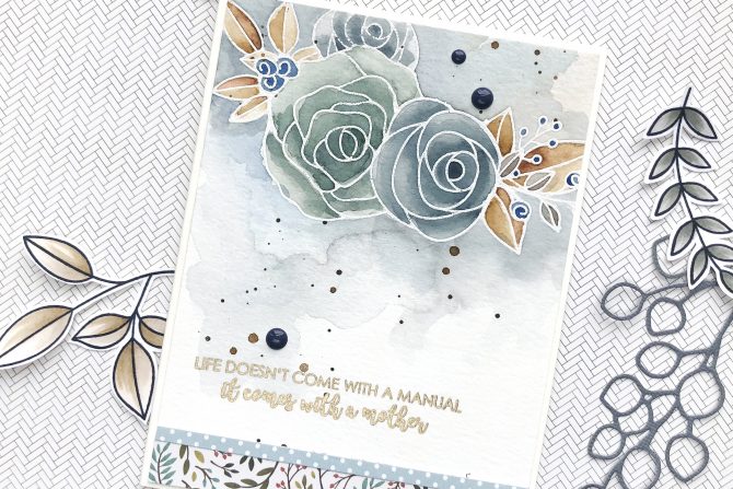 If you remember the other two cards I created and shared with you a week back for my first post as guest designer for Paper Roses Studio in April, you’ll recognize this color scheme from then. It’s different and beautiful and I wanted to keep doing more and more of it! Once I had painted in the leaves and flowers, I filled the background with mixes of the same colors in muddier tones. Last week’s cards were colored with Copic markers, and this week it’s about the watercolor paints. Mijello Mission Gold watercolor paints to be specific!